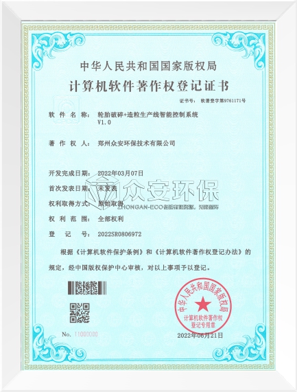 八月捷報頻傳,眾安環(huán)??蒲谐煽兺怀?,榮獲《輪胎破碎+造粒生產線智能控制系統V1.0》等多項軟件著作權,高精品控打造優(yōu)良產品,智慧軟件助力高端智能。